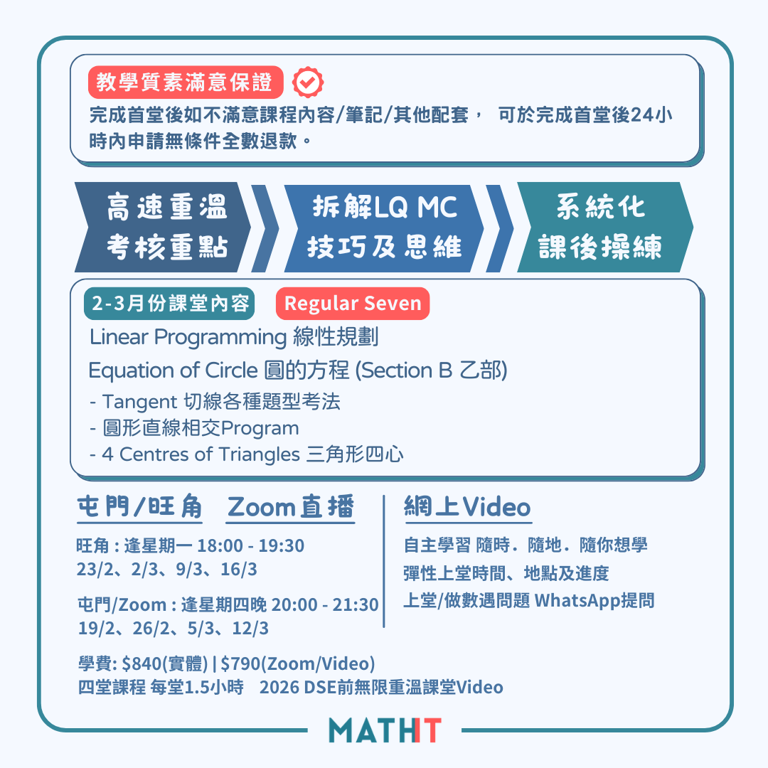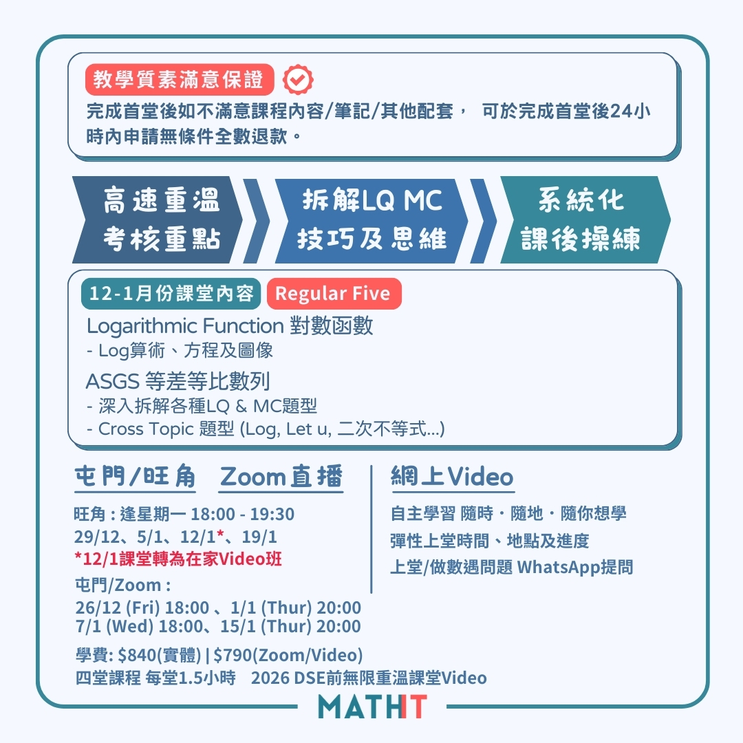 ![All-in-One 備戰班 [DSE穩4望5+]」是一個全方位的DSE數學補習課程,為期望在數學科達到Level 4以上的學生提供全面的訓練。這個高中數學補習課程結合了所有的考試技巧和必修知識點,讓學生在面對DSE數學科考試時能夠充滿自信。此外,我們也提供數學網上課程和數學Online Course,讓學生能夠在家裡學習。](https://files.cdn.thinkific.com/file_uploads/511760/images/b48/8f5/082/1.jpg)