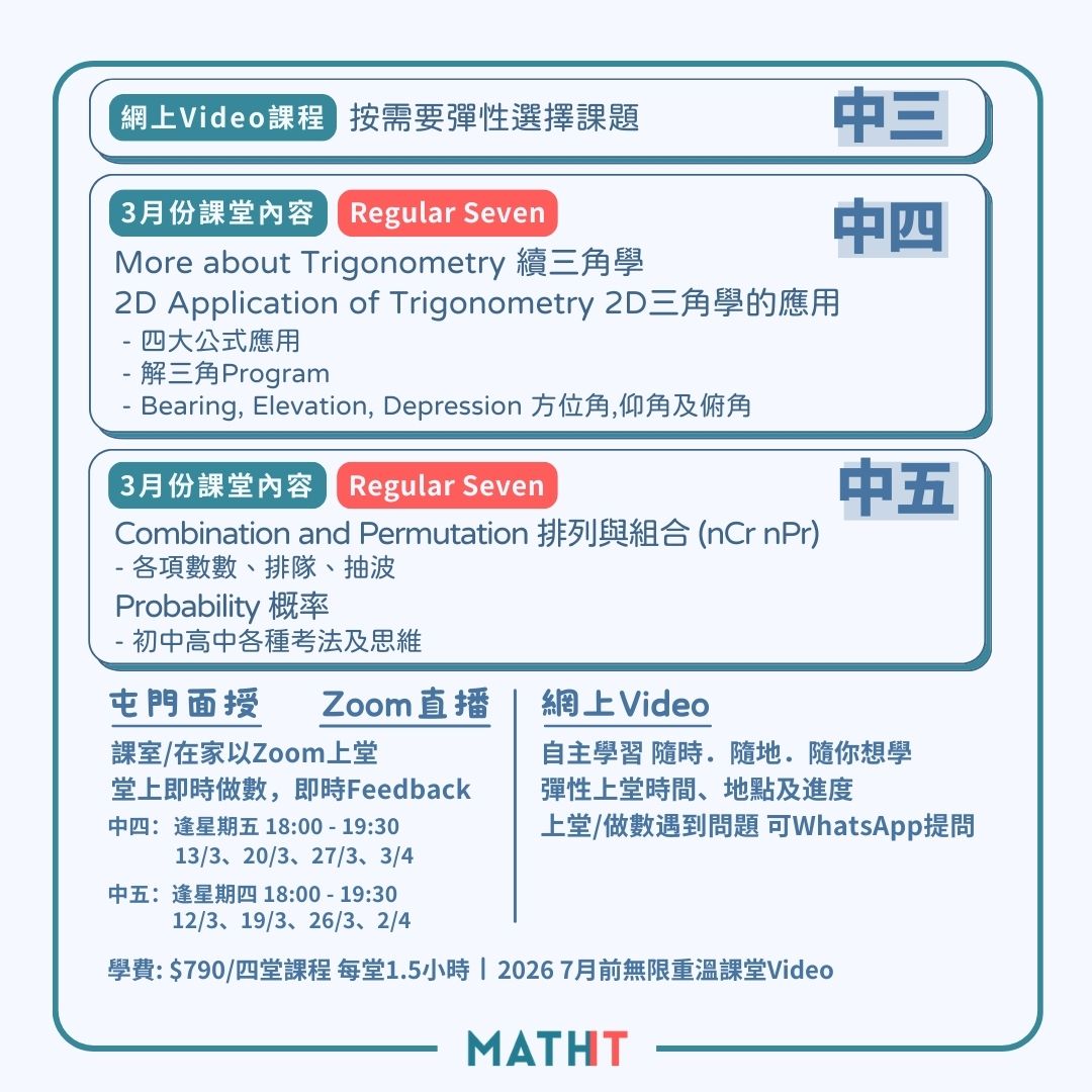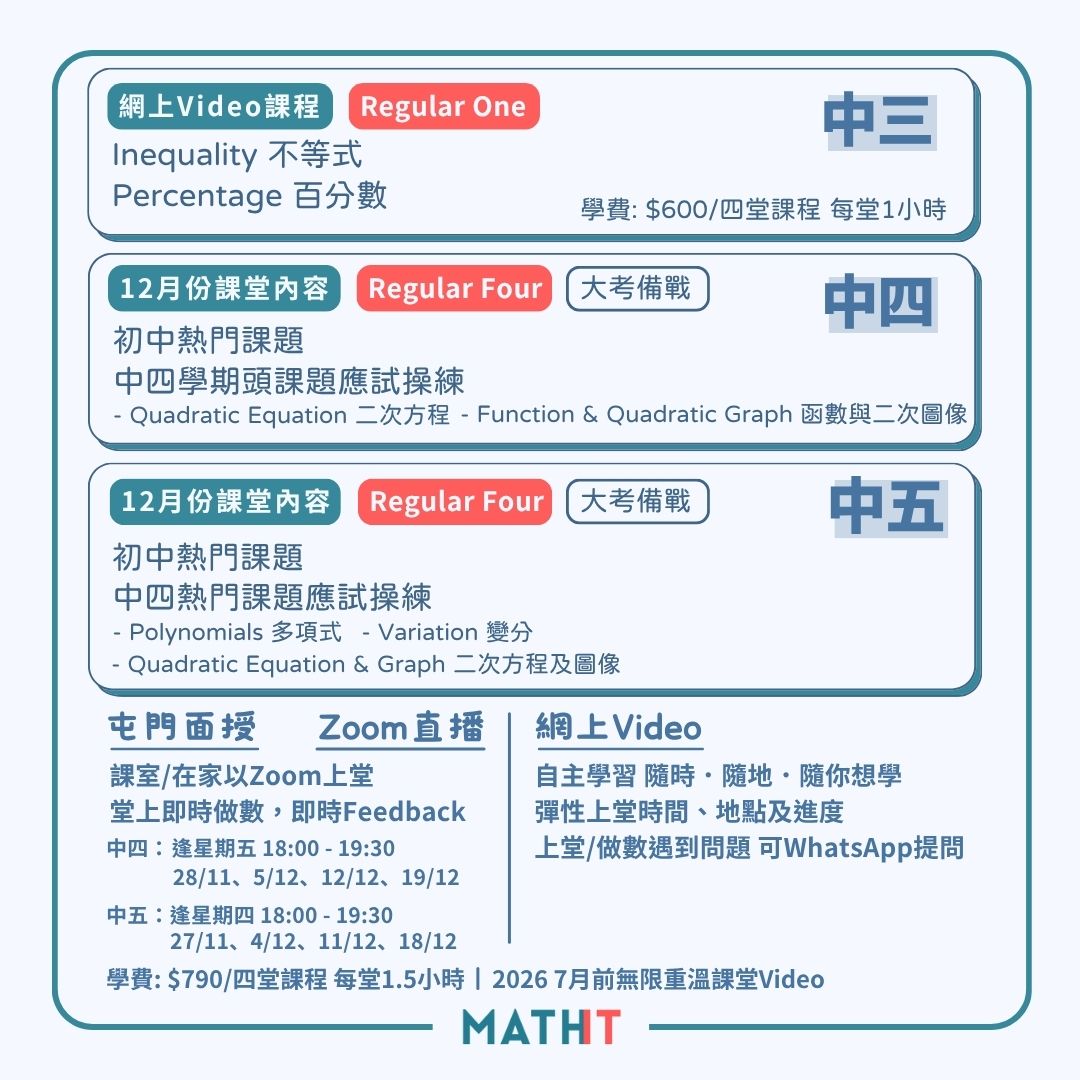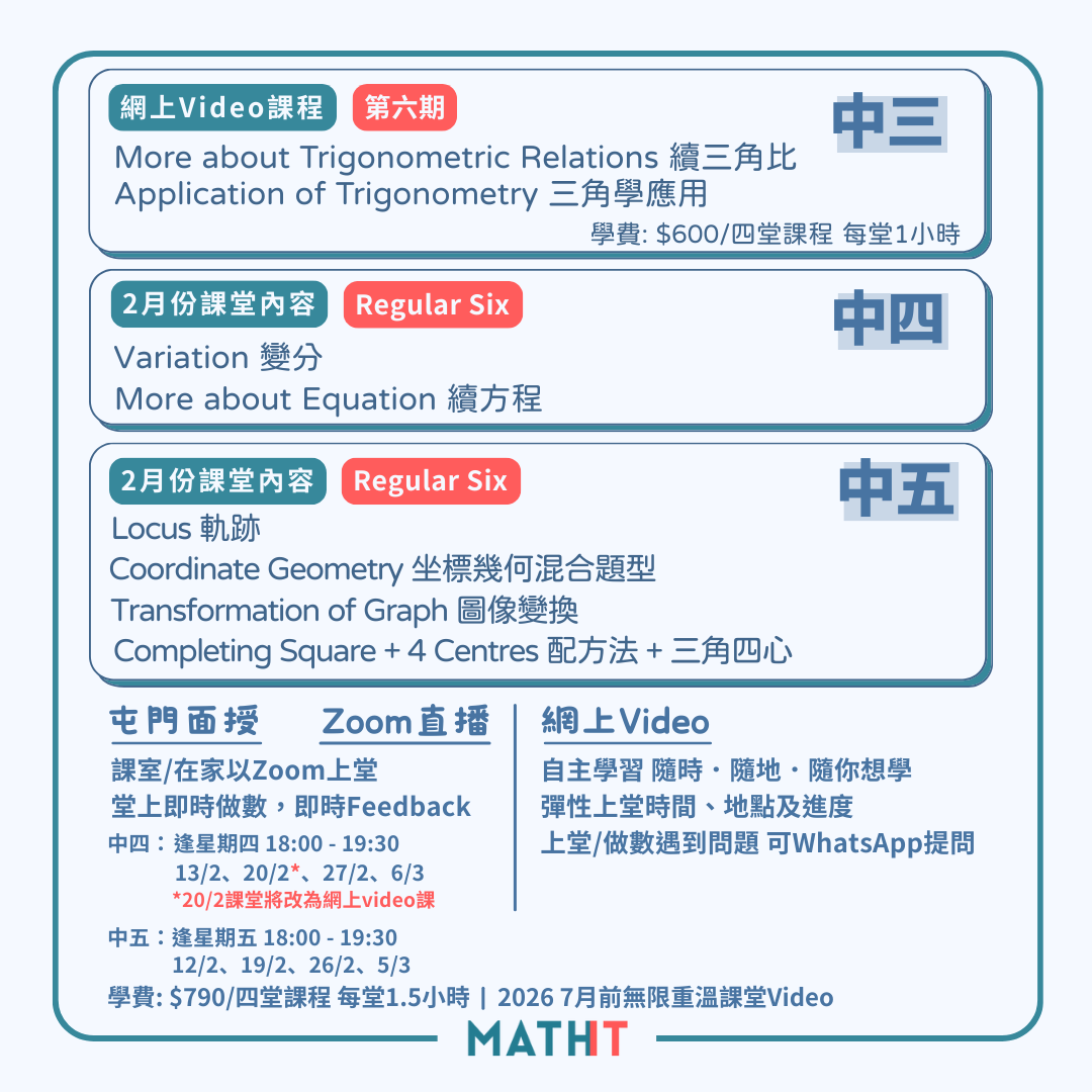 如果同學想加快進度,可以選擇報讀2025 中四中五堂規課程,全部各個課題已經上載,在可以即時收看。