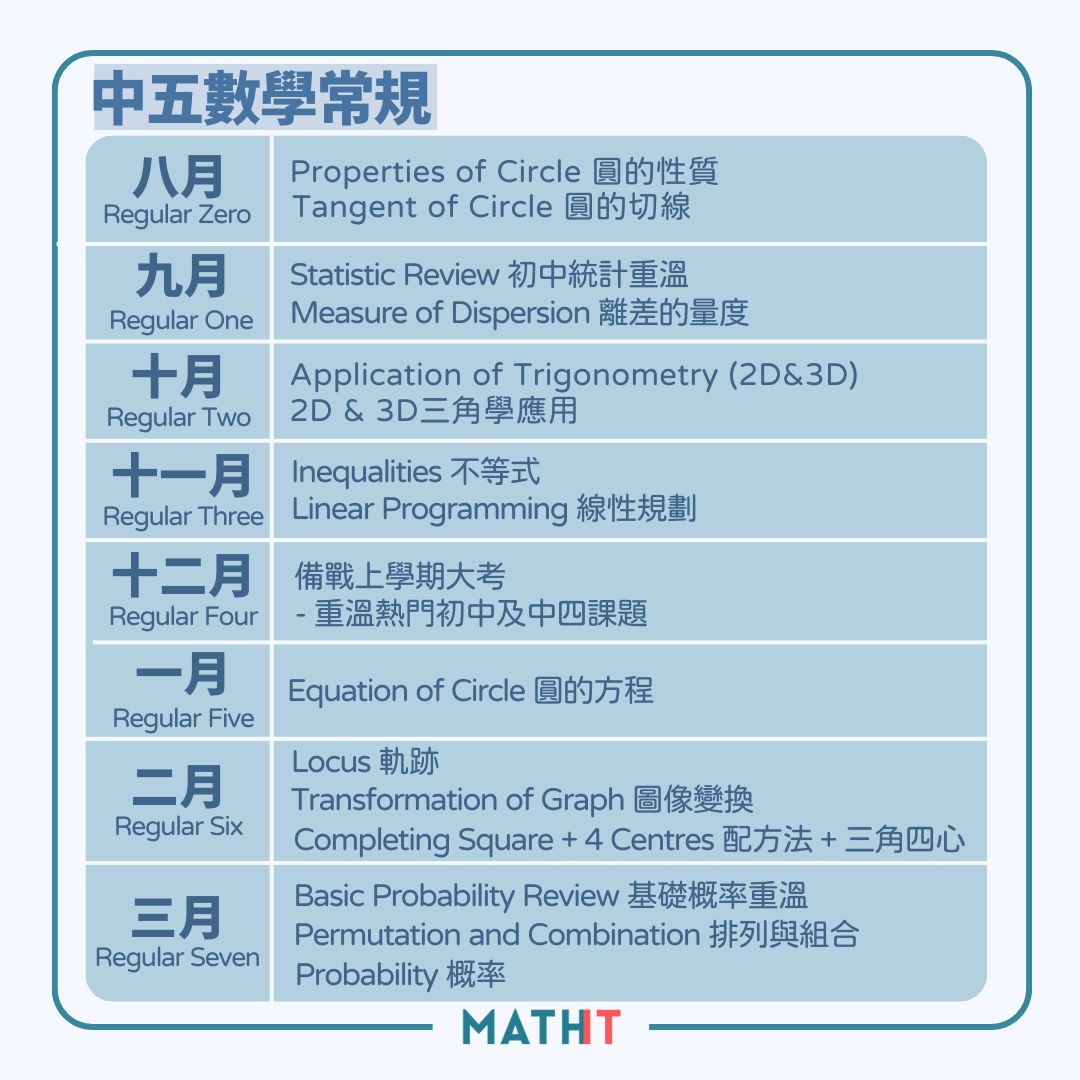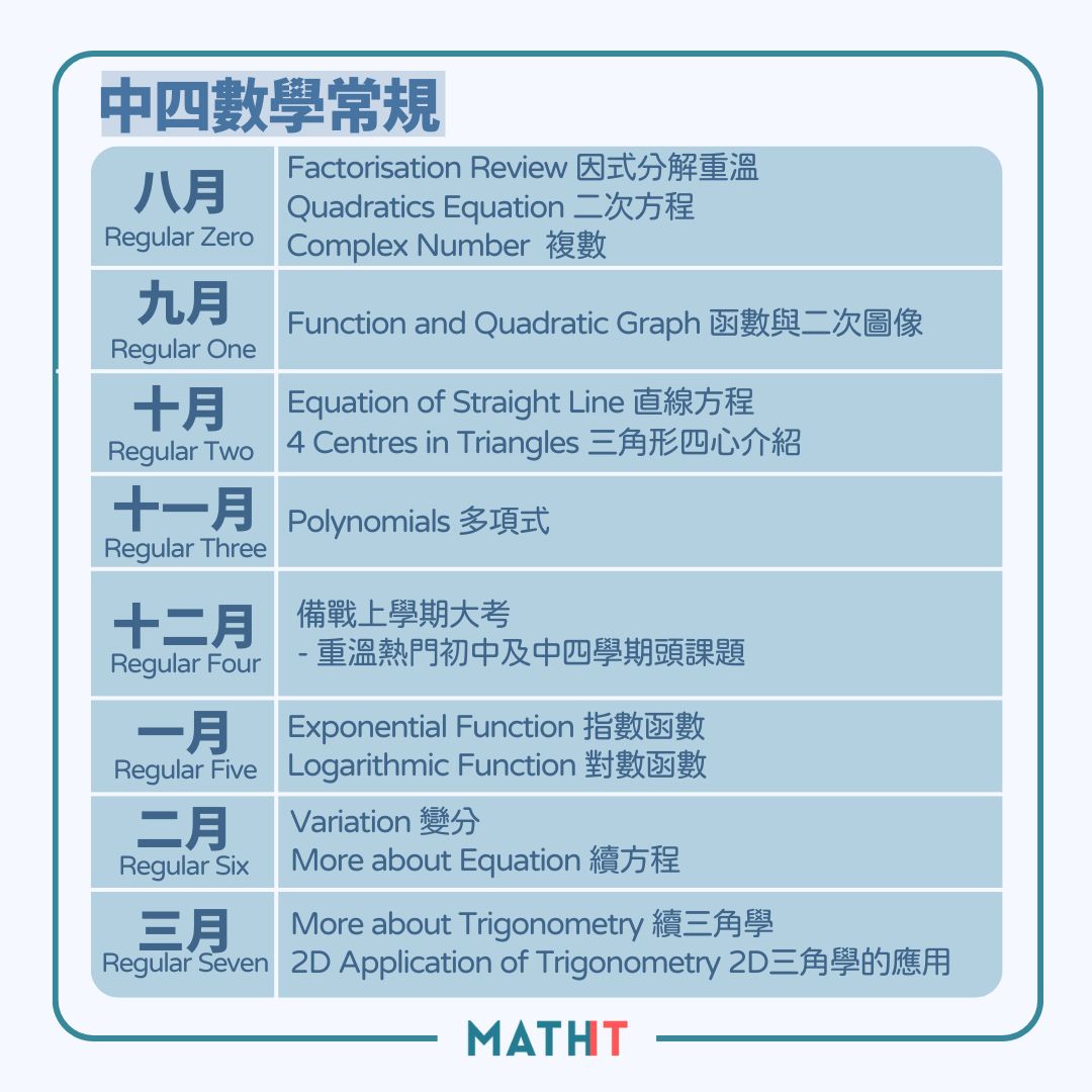 中四中五數學常規課程系專門設計俾任何程度同學報讀。課程會由淺入深教導同學每個課題的重要概念及不同考試題型的出題方法。